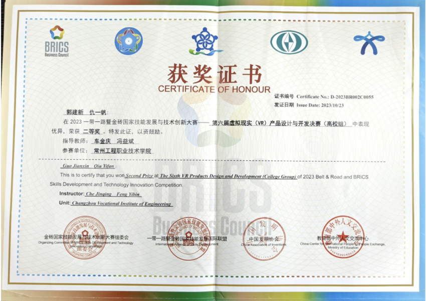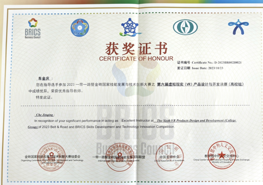 10月20日至23日,2023年一带一路暨金砖国家技能发展与技术创新大赛第六届“虚拟现实(VR)产品设计与开发” 赛项决赛在重庆科创职业学院举行。经过3天3场激烈角逐,我校yl6809永利检测中心、轨交装备学院车金庆、冯益斌两位教师指导的软件(卓越)2231郭建新、软件2113仇一帆两名同学荣获二等奖,冯益斌、车金庆两位教师荣获“优秀指导老师”,我校荣获“优秀组织奖”。