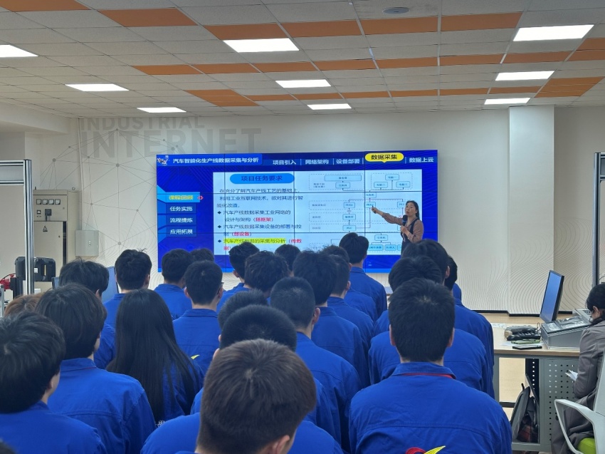本次公开示范课程为电气自动化技术专业核心课程《工业互联网》,授课内容是《汽车智能化产线数据采集与分析》,通过对课前学习数据的分析,精准把握本次课重难点,课中通过任务引领、问题导向,突破工业网关采集数据的重难点;通过小组合作探究,岗位分工、岗位轮换等方式进行实操练习,加深学生对工业网关采集知识点的理解、促进学生对技能点的强化。课堂教学课前课中课后环节逻辑严谨,教学资源形式丰富,思政融入精准有效,精心设计层层递进的课堂互动,引导学生有效达成教学目标。