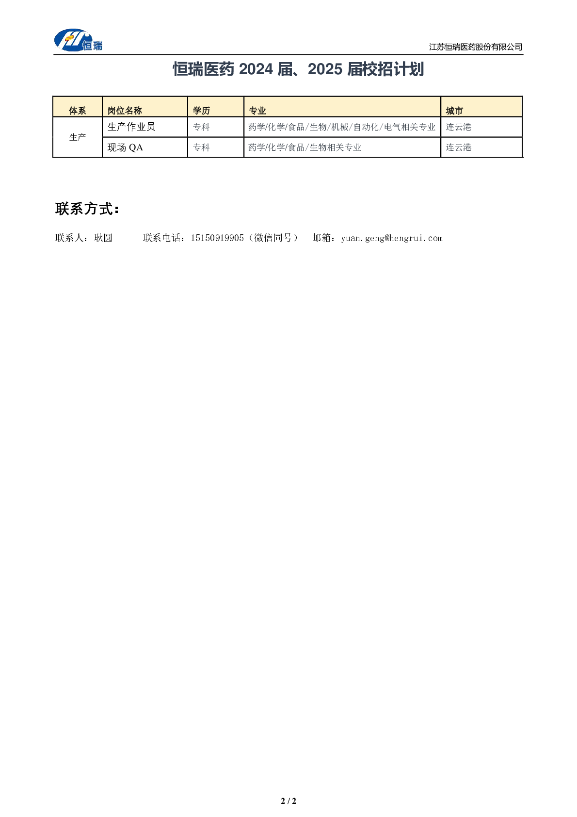 20240029恒瑞医药招聘简章