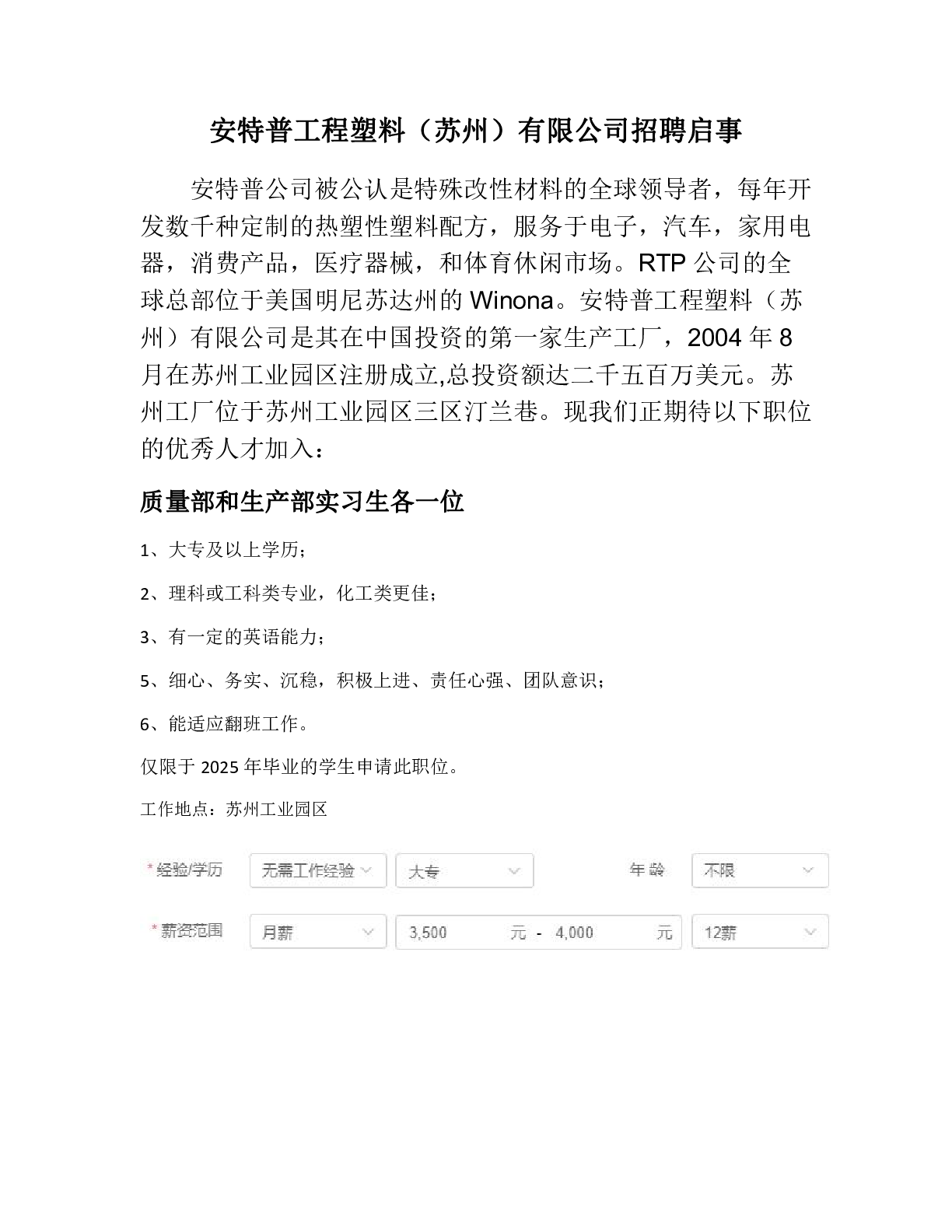 20240049安特普工程塑料(苏州)有限公司招聘信息