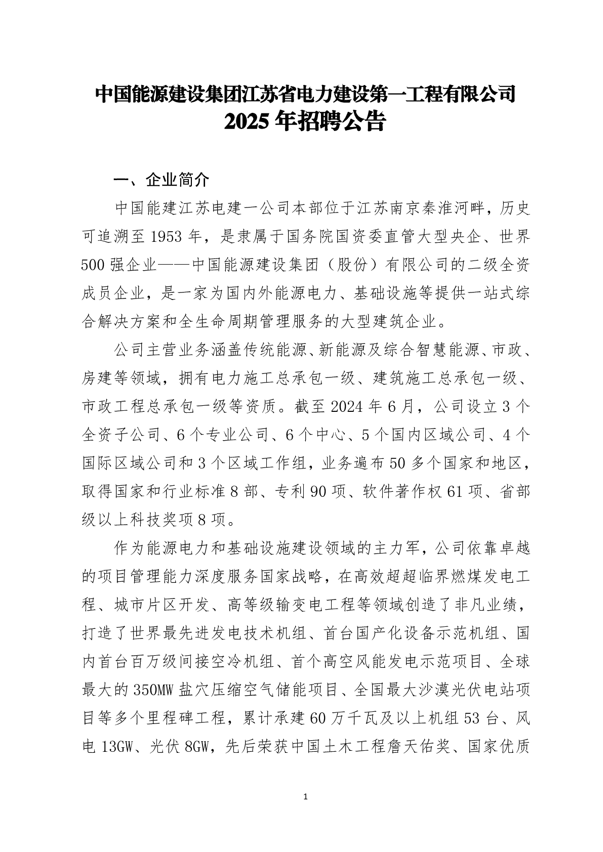 20250009中国能源建设集团江苏省电力建设第一工程有限公司招聘信息