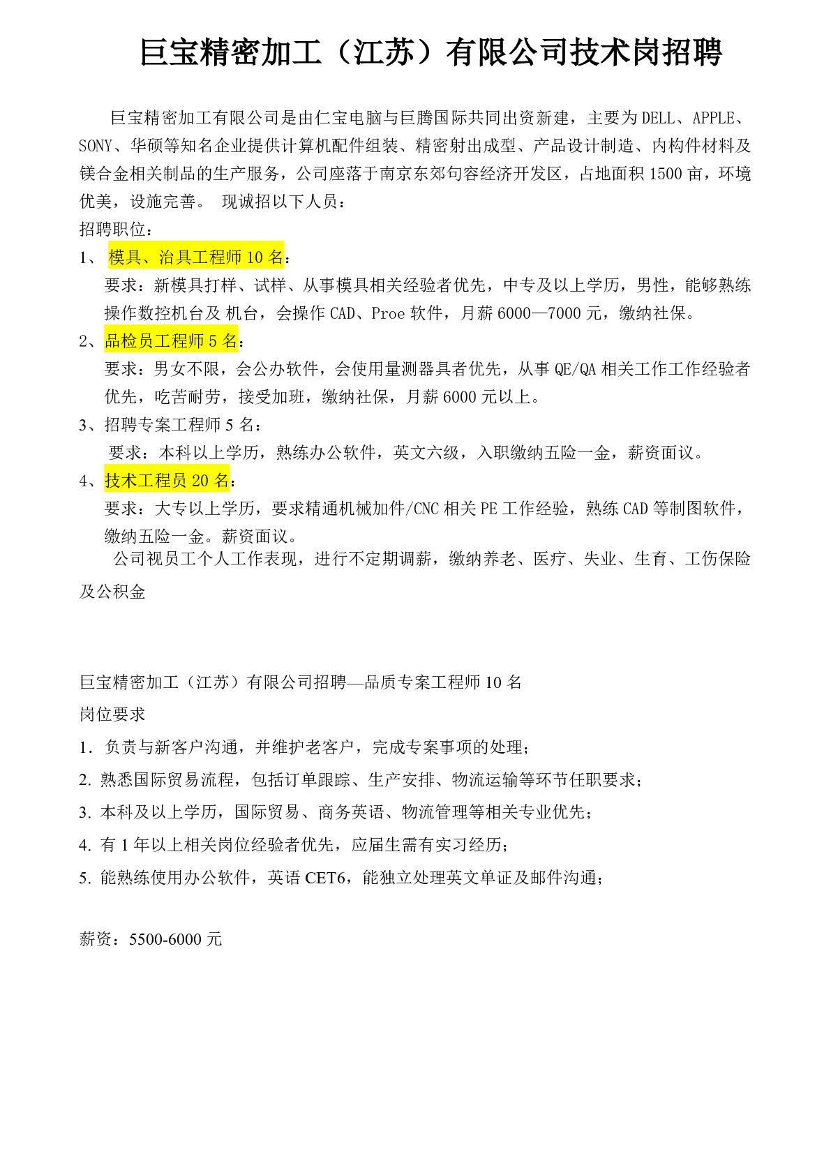 20260027巨宝精密加工(江苏)有限公司招聘信息